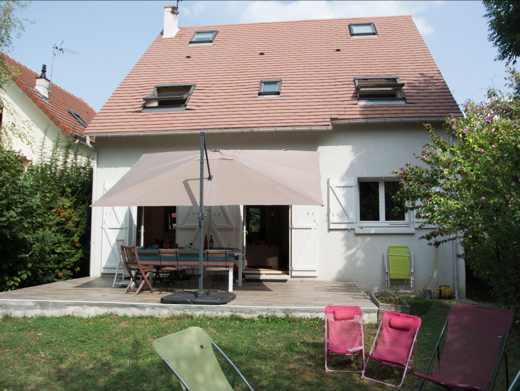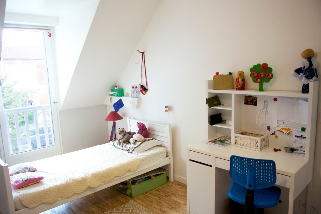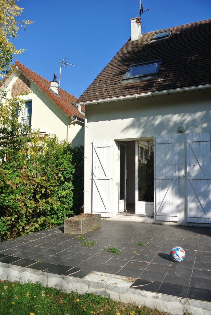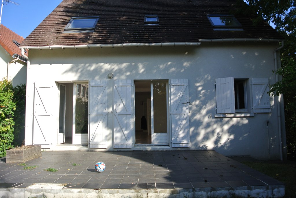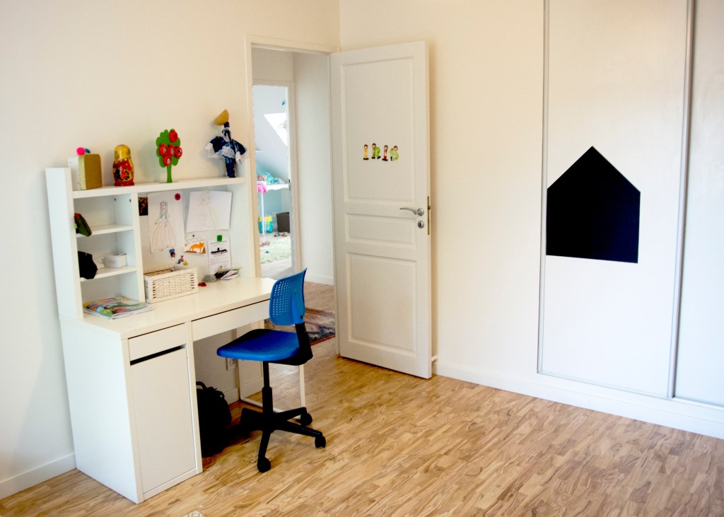 Cette grande maison impersonnelle à l’origine a su devenir lumineuse et moderne. Elle ne nécessitait pas de grandes transformations. Un changement des matériaux et quelques astuces ont permis de la transformer à moindre coût. Les beaux volumes de la maison ont été épuré et adapté aux habitudes de cette famille avec trois enfants. La mise en place d’une cuisine Ikea a permis d’exploiter aux maximum l’espace grâce aux nombreux rangements et à la création d’un espace petit déjeuner. Une connexion directe avec le salon, avec la mise en place d’une porte coulissante invisible, a permis d’ajouter de la lumière. Le salon et le coin repas ont été modernisé grâce aux changement des matériaux et des mobiliers de style scandinave. Le sol de la terrasse à l’extérieure, avec ses problèmes d’étanchéité, a été remplacé par du carrelage imitation parquet. Cela donne un aspect chaleureux, comme une prolongation du salon vers l’extérieur. A l’étage, les chambres ont été renouvelé avec la mise en place d’étagères et de placards sur mesure. La pose d’un parquet en olivier, sur tout l’étage, unifie et donne plus d’harmonie. Dans la chambre parentale, le placard sur le lit, permet d’exploiter l’espace avec de nombreux rangements. Le relooking d’inspiration scandinave, rend la maison plus lumineuse et quelques touches de couleurs ravivent subtilement les pièces.