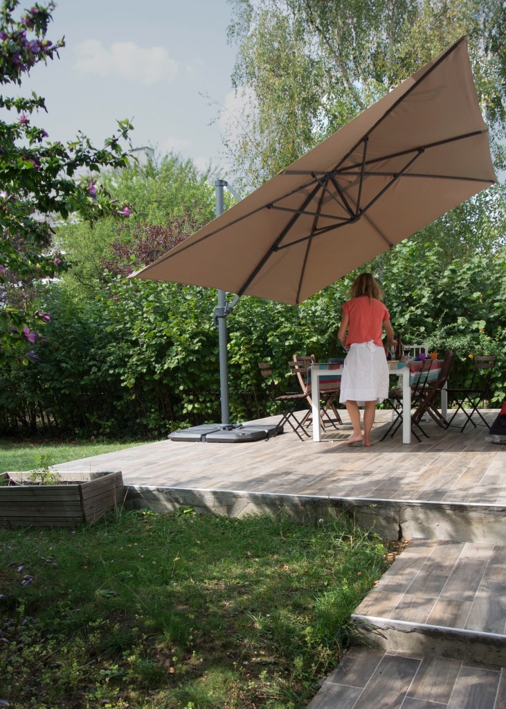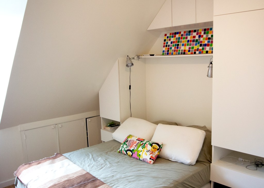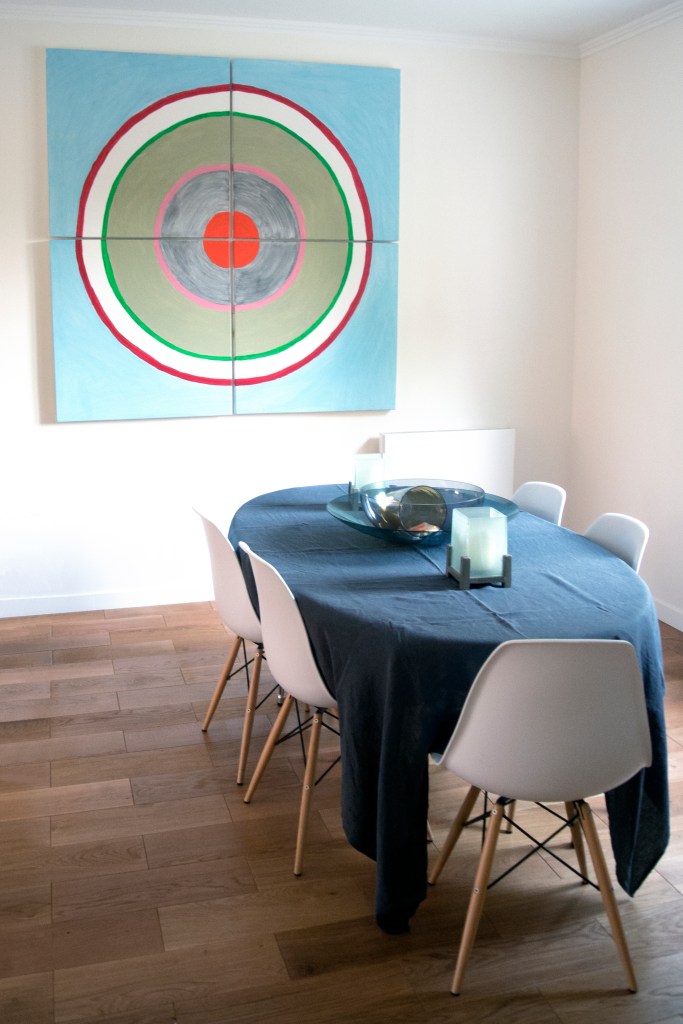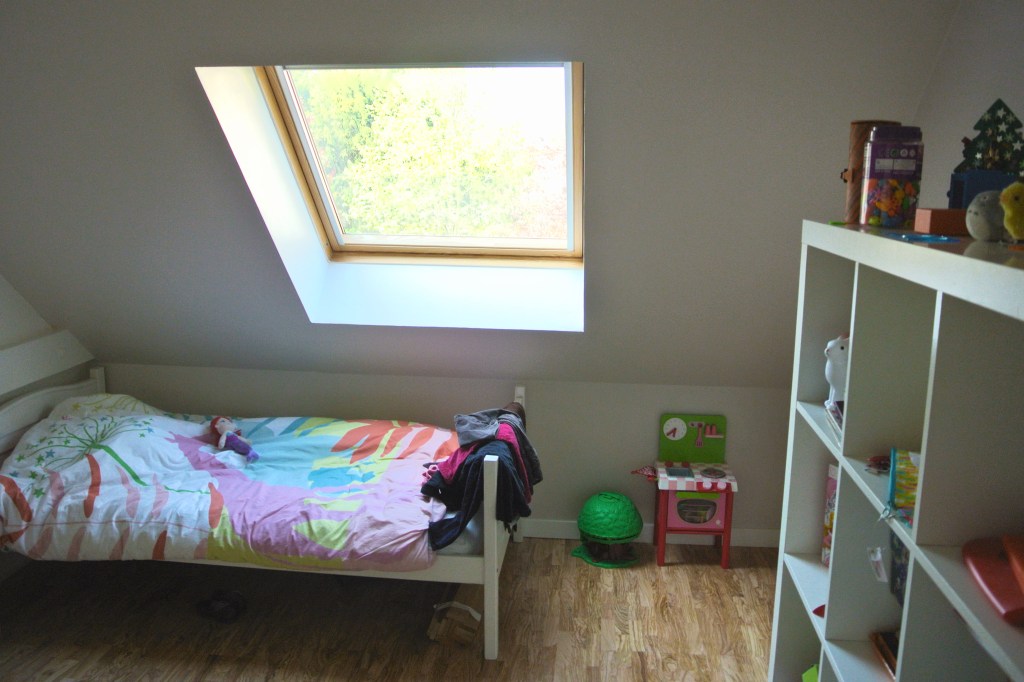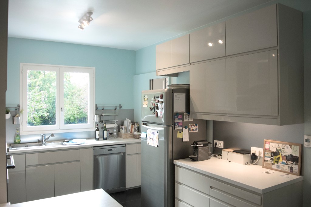 Cette grande maison impersonnelle à l’origine a su devenir lumineuse et moderne. Elle ne nécessitait pas de grandes transformations. Un changement des matériaux et quelques astuces ont permis de la transformer à moindre coût. Les beaux volumes de la maison ont été épuré et adapté aux habitudes de cette famille avec trois enfants. La mise en place d’une cuisine Ikea a permis d’exploiter aux maximum l’espace grâce aux nombreux rangements et à la création d’un espace petit déjeuner. Une connexion directe avec le salon, avec la mise en place d’une porte coulissante invisible, a permis d’ajouter de la lumière. Le salon et le coin repas ont été modernisé grâce aux changement des matériaux et des mobiliers de style scandinave. Le sol de la terrasse à l’extérieure, avec ses problèmes d’étanchéité, a été remplacé par du carrelage imitation parquet. Cela donne un aspect chaleureux, comme une prolongation du salon vers l’extérieur. A l’étage, les chambres ont été renouvelé avec la mise en place d’étagères et de placards sur mesure. La pose d’un parquet en olivier, sur tout l’étage, unifie et donne plus d’harmonie. Dans la chambre parentale, le placard sur le lit, permet d’exploiter l’espace avec de nombreux rangements. Le relooking d’inspiration scandinave, rend la maison plus lumineuse et quelques touches de couleurs ravivent subtilement les pièces.